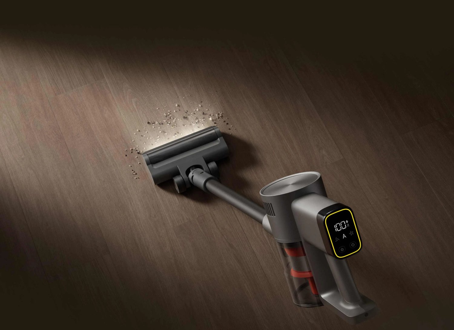 Na rączce ulokowany został cyfrowy wyświetlacz, który informuje o poziomie zabrudzenia, aktualnym trybie pracy oraz stanie naładowania akumulatora. To wygodne rozwiązanie, które pozwala szybko ocenić ile jeszcze czasu odkurzacz może pracować. Warto też wspomnieć o oświetleniu LED wbudowanym w szczotkę. Jest to detal, ale bardzo praktyczny, szczególnie podczas sprzątania pod meblami lub w ciemnych zakamarkach.
